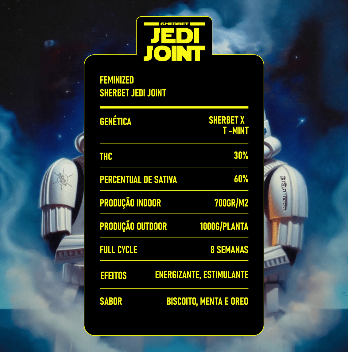 Descrição estendida: Sherbet Jedi Joint é uma poderosa variedade híbrida, fruto do cruzamento entre Sherbet e T-Mint. Com 60% de predominância Sativa, esta variedade energiza o seu dia com uma experiência vibrante e estimulante. Seu sabor é intenso e marcante, com uma base dominante de biscoito enriquecida por frescas notas de menta e Oreo, que amplificam seus efeitos revigorantes. Seu processo de cultivo meticuloso garante colheitas excepcionais em ambientes internos e externos, tornando Sherbet Jedi Joint a escolha perfeita para quem procura produtividade e uma fumaça cheia de sabor.